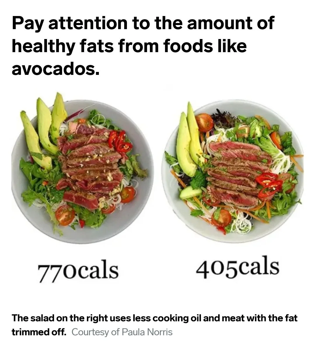 In the first two photos below, they're all healthy meals. But small changes in those meals dramatically reduce the Calorie intake. Avocado, for example, is a very very healthy food to eat. It is high in “Good Fats”. Like Olive Oil and almonds, it is healthy and can be part of a Clean Eating Plan. But as you all know, it is very high in calories, and eating a lot of it will actually hinder your ability to lose weight due to it’s high calorie content. So if you're just doing clean eating, go for it. However, if you're doing a calorie restriction plan, it's best to reduce as much as possible.
